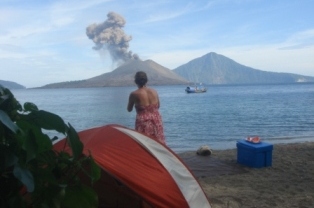 We go by cruise to the child of Krakatau, landing and hike up The view is really fantastic, with a mix of pristine sea, very green vegetation, and apocalyptic porous red-volcanic rocks dropping all the way from the crater deep into the sea. The trek is very easy, and first starts in dense and healthy jungle, sThe view is really fantastic, with a mix of pristine sea, very green vegetation, and apocalyptic porous red-volcanic rocks dropping all the way from the crater deep into the sea. The trek is very easy, and first starts in dense and healthy jungle, soon after progressing onto volcanic ash slopes. Preparing camping for overnight, diiner and free time